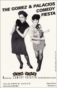 I made my way to San Francisco, figured out I was a comic in desperate need of a comedy club. And BAM, a lesbian comedian was born. I was a novelty back then in 1982 because I was a 23 year old California native Chicana comic and a lesbian, to boot! Being very in your face about nationality and sexuality. I was called “controversial” and other names that begin with a ‘C’. Correct me if I’m wrong, people, but I believe I am the first Chicana lesbian comic to expose my inner most jokes on stage. Yes, my dear friend and the mother of my children, the amazing Marga Gomez was also doing her lesbo thing as well but she’s from New York and not Chicana. Of course we connected as a team and became known as Gomez & Palacios, The Only Latin Female Comedy Duo in The Universe. Did anybody ever see our very first show, on Ash Wednesday February 16, 1983? Those who wore ashes on their foreheads got 50 cents off the $3 admission. Yeah, that night we were high class professionals and a little drunk. But we made history being the first Latina lesbian comedy team—again, if somebody can prove me wrong, please inform me over a vegan meal—your treat.