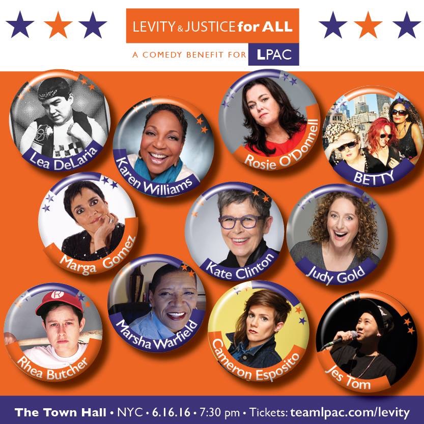 LPAC, the national grassroots lesbian political action committee supporting pro-LGBTQ, pro-women’s rights and progressive candidates, announced a first-of-its-kind benefit performance featuring top lesbian and queer comics and women’s rights champions, including Kate Clinton, Rosie O’Donnell, Billie Jean King, Lea DeLaria, Karen Williams, Cameron Esposito, Judy Gold, Marga Gomez, Jes Tom, Marsha Warfield, Rhea Butcher, and others. Former Late Show with David Letterman Executive Producer and Showrunner Barbara Gaines will produce the show. Award-winning cartoonist and author Alison Bechdel will be designing an original poster for the event. Levity & Justice for All will take place at the historic Town Hall on June 16, 2016, and will celebrate the political voices, humor, and activism of LGBTQ women, inspiring and motivating those in attendance to actively participate in the 2016 election.
